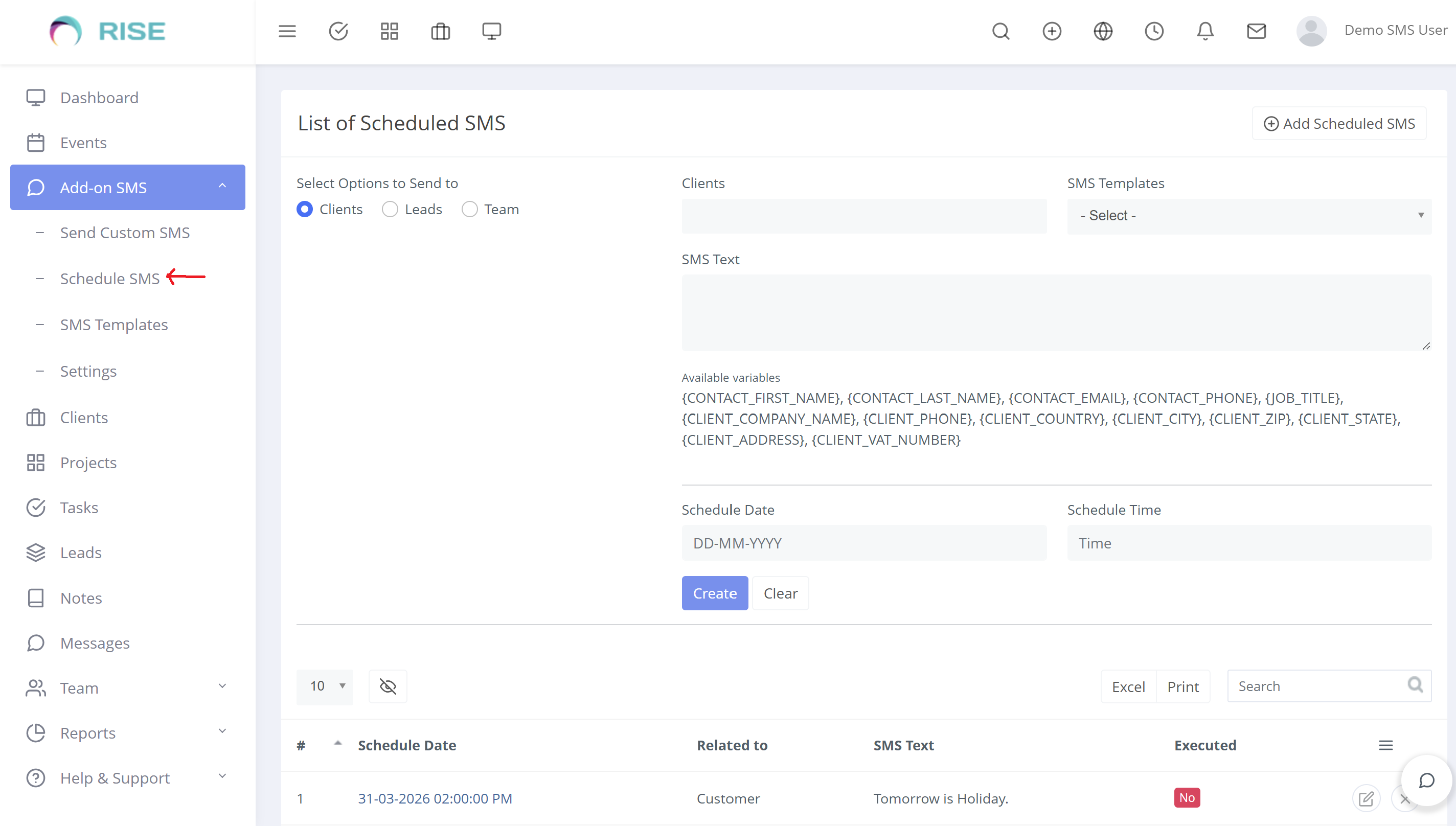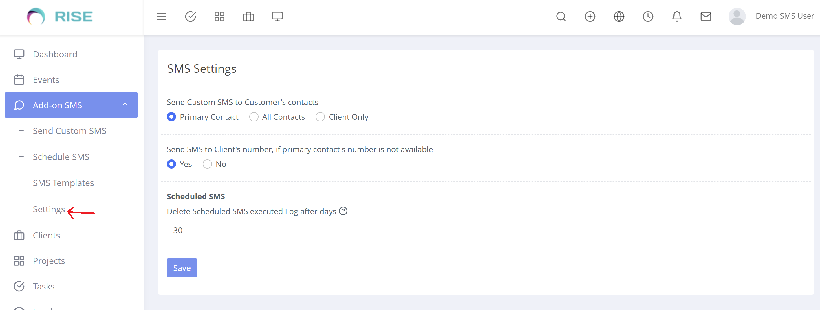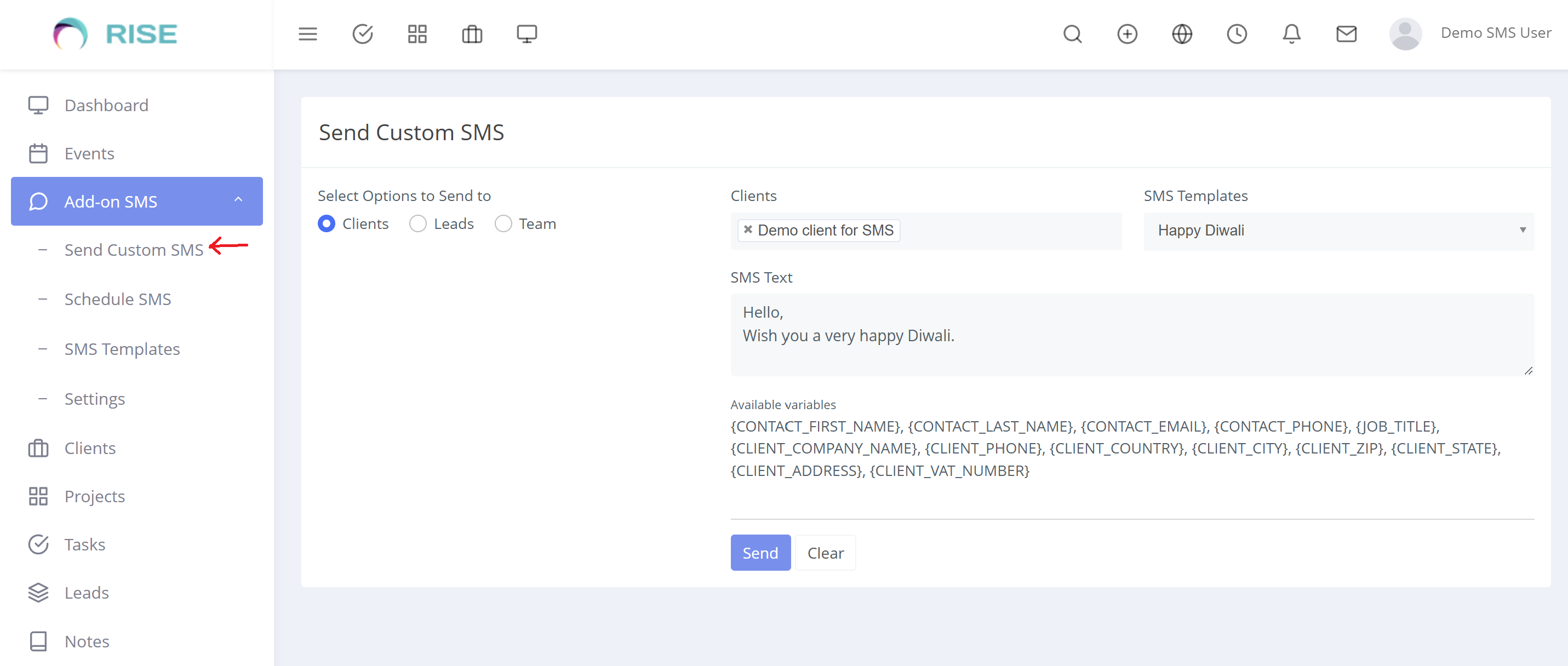 “Add-on SMS Manager”, plugin can be use in Rise CRM to Extends its default functionality for sending SMS to clients, Leads or Staff (Team).